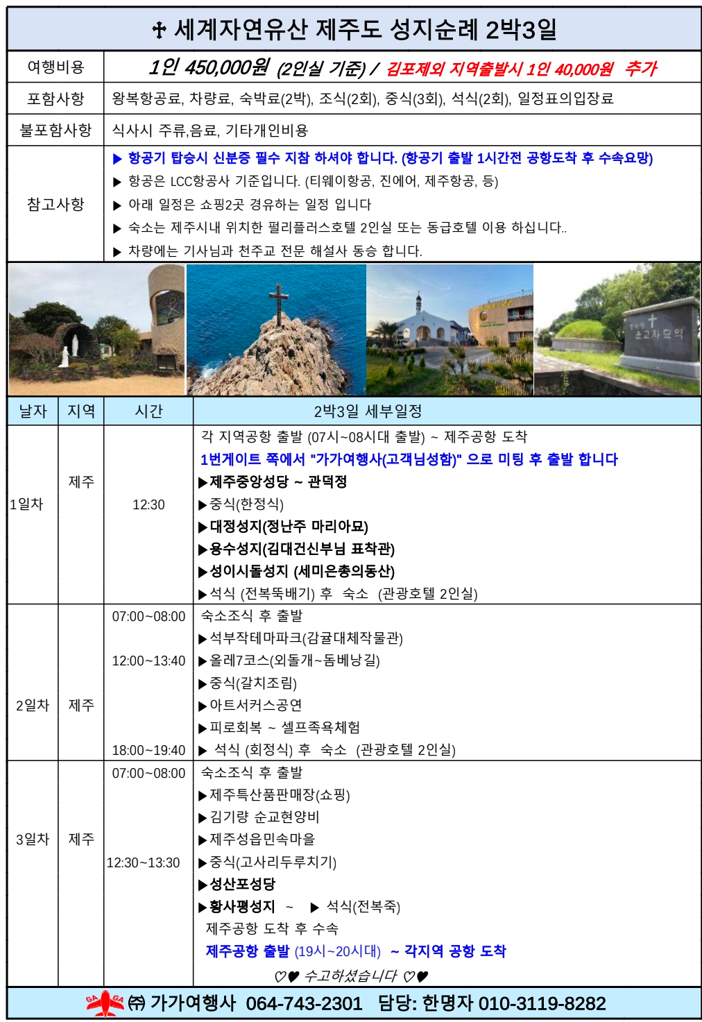 성지순례/2박3일 중앙성당 단순한 종교 시설을 넘어, 제주 천주교의 역사와 문화가 살아 숨 쉬는 공간이에요. 여행 중 신앙적 체험이나 건축적 아름다움을 느끼고 싶다면 꼭 들러볼 만한 장소입니다. 관덕정 1901년 ‘이재수의 난 당시 천주교 신자들이 처형된 장소로 기록됩니다.이 사건은 제주 민중이 세금 수탈과 외래 종교의 폐단에 반발해 일어난 대규모 항쟁 입니다. 대정성지 정난주 마리아 묘 황사영 백서 사건으로 순교한 황사영의 부인, 다산 정약용의 조카인 정난주 마리아가 유배되어 생을 마친 뒤 묻힌 곳입니다 용수성지 천주교 용수성지는 한국 최초의 사제 성 김대건 안드레아 신부가 귀국길에 풍랑을 만나 표착했던 역사적 장소입니다. 지금은 기념 성당과 기념관이 세워져 있어요 성이시돌 맥그린치 신부가 설립한 곳입니다. 단순한 관광지가 아니라, 제주의 농업·목축 발전과 신앙적 의미가 함께 깃든 장소입니다. 석부작테마파크 제주 화산석과 야생화가 빚어낸 자연 예술을 감상하며 산책과 체험을 동시에 즐길 수 있는 힐링 명소입니다. 올래7코스 올레길 7코스는 **서귀포 해안의 절경과 마을 풍경을 모두 담은 ‘명품 코스’**로 불립니다. 아트서커스 화려한 무대와 긴장감 넘치는 묘기가 어우러져 아이부터 어른까지 모두에게 잊지 못할 추억을 선사합니다. 셀프족욕 제주 여행 중 발이 피곤할 때, 이런 족욕 카페에서 잠시 쉬어가면 여행의 질이 훨씬 높아질 거예요. 특산품판매장 기념품 쇼핑에 최적화된 장소 각각의 특색이 있습니다. 여행을 마무리하며 선물을 준비하려면 가장 알맞습니다. 김기량 순교현양비 제주 출신 최초의 세례자이자 순교자로, ‘제주의 사도’라 불립니다. 그는 1867년 병인박해 때 통영에서 체포되어 신앙을 굳게 지키다 교수형으로 순교했습니다. 성읍민속마을 옛 제주인의 삶과 문화를 직접 체험할 수 있는 살아있는 역사 공간입니다. 돌담길과 초가집을 거닐며 과거로 시간여행을 떠나는 듯한 특별한 경험을 할 수 있어요. 성산포성당 성산포성당은 제주 성산일출봉을 배경으로 한 아름다운 성당으로, 경치와 신앙을 함께 느낄 수 있는 명소입니다. 황사평 성지 1901년 신축교안 당시 학살된 수백 명의 천주교 신자들이 묻힌 장소로, 제주 천주교의 대표적인 성지이자 추모 공간입니다. 해녀촌 신선한 생선회 해산물과 특별한 회국수 전복죽를 맛볼 수 있는 대표적인 맛집입니다.
